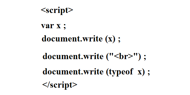 ভ্যালুহীন ভ্যারিয়বেলকে Undefined data Type বলা হয় । যেমন var x ; - এখানে কীওয়ার্ড (keyword) লেখা হয়েছে তার পর ভ্যারিয়বেলের নাম লেখা হয়েছে কিন্তু কোন ভ্যালু ডিক্লিয়ার করা হয়নি তাই এটি Undefined ভ্যালু ।