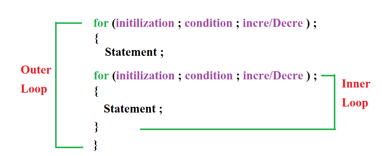 প্রয়োজন অনুযায়ী প্রোগ্রামে একটি লুপের ভিতরে অপর একটি লুপ প্রয়োগ করার পদ্ধতিকে Nasted Loop বলা হয় । প্রথম লুপটিকে বলা হয় Outer Loop অর্থাৎ OL এবং অভ্যন্তরীণ লুপটিকে বলা হয় Inner Loop অর্থাৎ IL । স্মরণ রাখবেন যেকোনো লুপের Nasted Loop তৈরি করা যায় ।