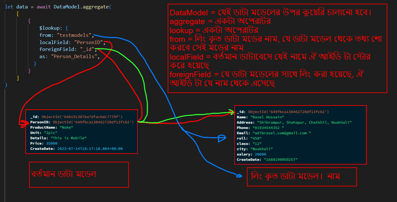 localField = বর্তমান ডাটাবেসে যেই নামে ঐ আইডি টা স্টোর করে হয়েছে